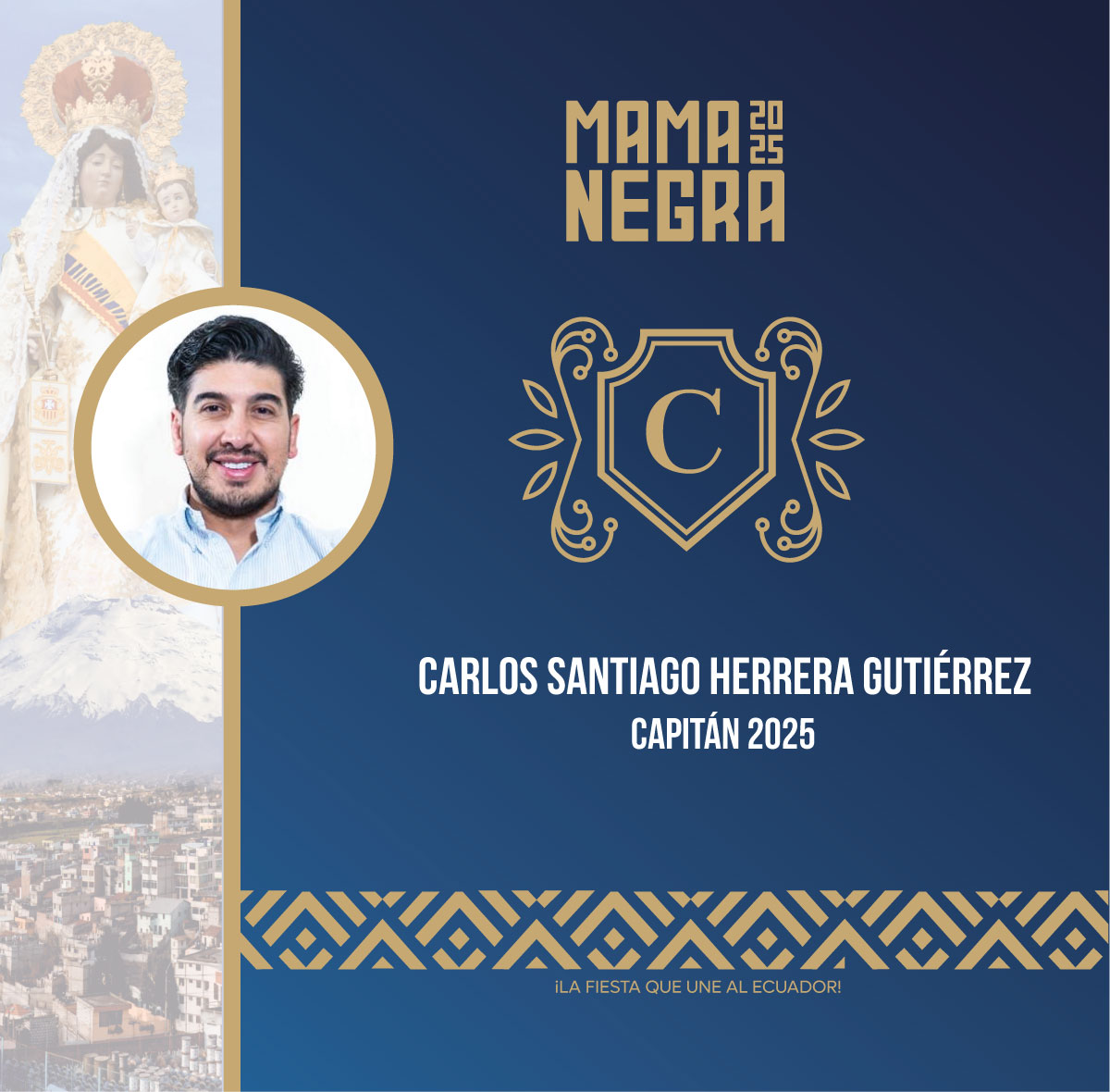 Personaje principal de la fiesta, de allí el nombre del teatro popular: "Capitanía de la Mama Negra". Representa a una autoridad colonial local, viste de traje militar y es el prioste mayor de la fiesta. Recibe honores, luego de los realizados a la Virgen María; en el pecho le cruza un "tahalí" de forma rectangular, como parte de su singular trajería, propia del personaje que representa.